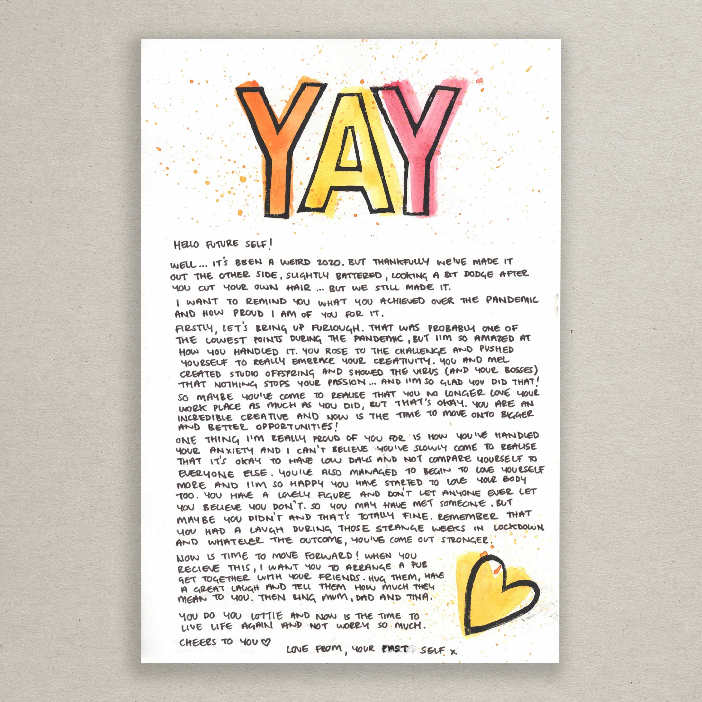 It's something to do and something to look forward to – the plan is to reunite you with your letters at a big exhibition party when we're all allowed to mingle again.